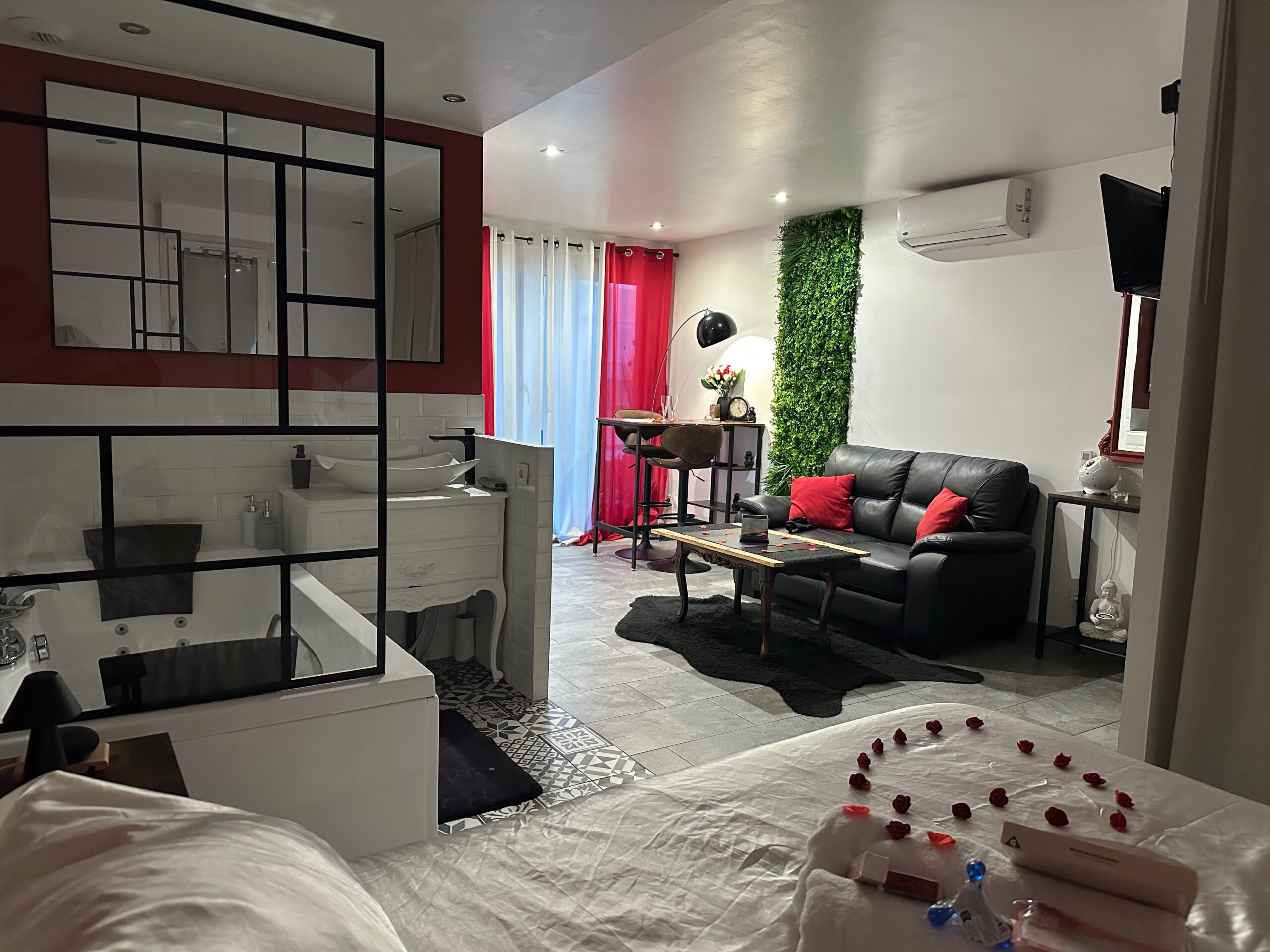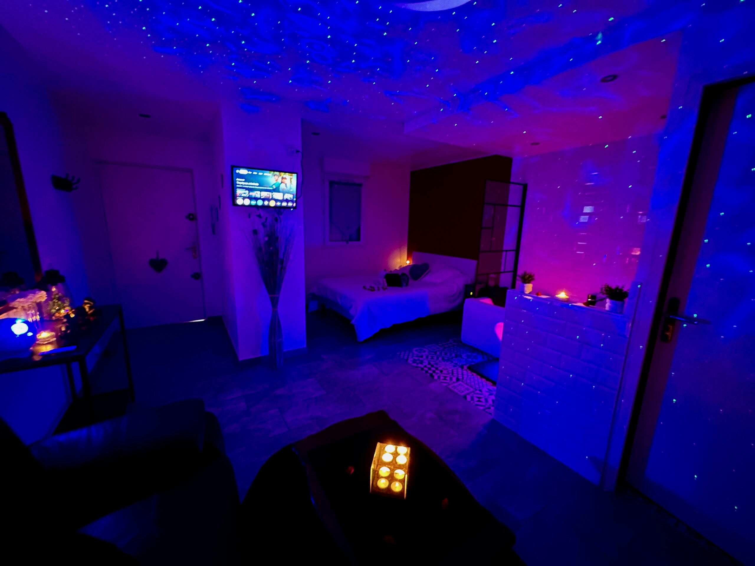 Love room située entre Antibes et Cannes à Golfe Juan,  Amour Azur est un appartement qui a été entièrement refait et pensé pour donner l’opportunité aux couples de vouloir se faire une soirée en amoureux à proximité de chez eux dans un cadre romantique. L’idée de départ de la love room vient d’un besoin de s’échapper à deux le temps d’une soirée ou d’un week-end en amoureux.